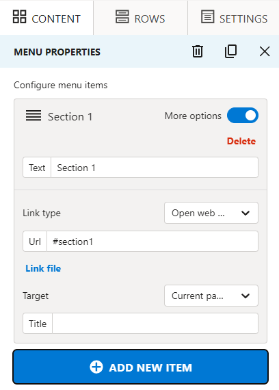 - With a Menu block, open the additional options and set the URL to "#section1" (the # plus your anchor name). For other blocks, use Insert link and set the URL there.