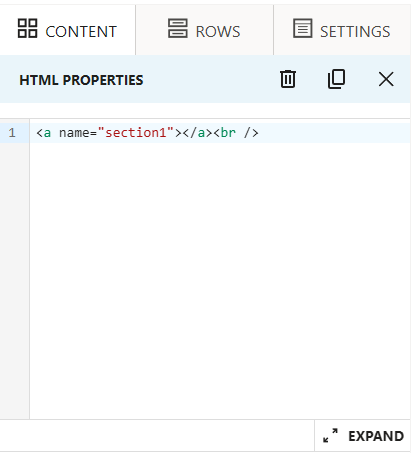 Drag a Custom HTML content block to the spot you want the jump to go to (e.g., above a section heading).- In the HTML for that block, add something like: <a name="section1"></a><br /> , replacing 'section1' with your own unique name. Make it simple and memorable, because you’ll reference it in the link.