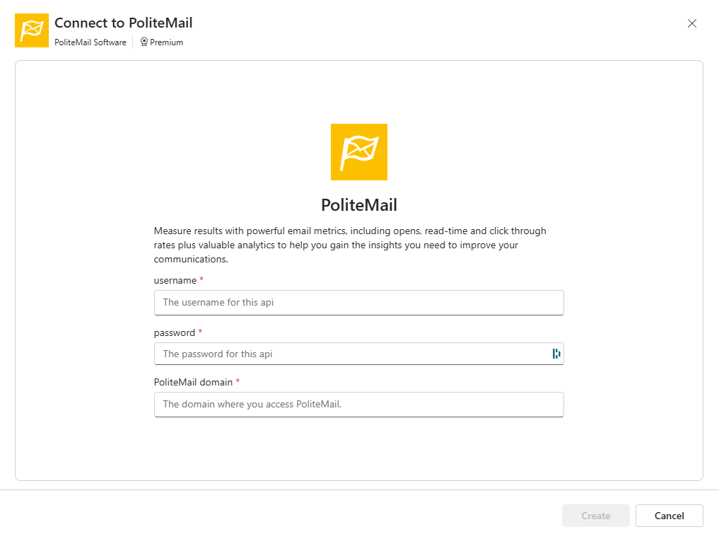 Once entered, click 'Create'. Power Automate will attempt to use your information to create a secure connection to PoliteMail so that you can now build a flow using it.